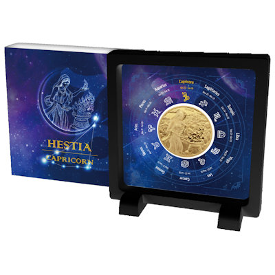 In der dunkelsten Zeit des Jahres, um die Wintersonnenwende, feiern die Steinböcke Geburtstag. In den langen, kalten Nächten ist ein Feuer besonders wichtig: Es spendet Wärme und Licht. Gehütet wird es nach antiker Vorstellung von der Göttin Hestia. Deshalb ziert sie auch das Motiv der Kupfermünze zum Sternzeichen Steinbock aus der Serie Olympians & Zodiac. Das Sammlerstück ist verpackt in ein Etui mit Aufsteller und hat eine limitierte Auflage von 3.000 Exemplaren.