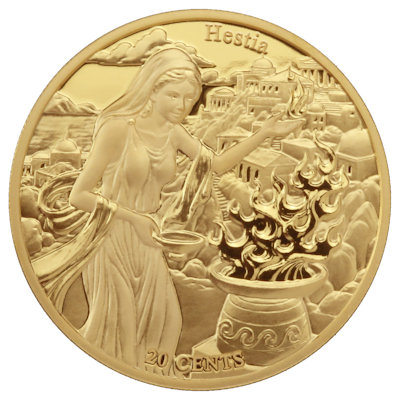 Von der Göttin Hestia (lateinisch Vesta) sind nur wenige Mythen bekannt und doch wurde sie in jedem Haus verehrt. Schließlich hatte sie als Bewahrerin des Herdfeuers eine lebenswichtige Aufgabe. Ihr Charakter scheint dieser ebenso wichtigen wie profanen Pflicht entsprechend ruhig und zuverlässig zu sein. Sie stiftet die Menschen nicht zu Kriegen an und hat keine Affären. Sanftmütig erscheint sie auf dem Motiv der Kupfermünze, wie sie in ihren fließenden Gewändern an der Feuerschale steht. In der einen Hand hält sie eine Schale, in der anderen eine kleine Flamme. Oben ist randläufig der Name der Göttin verzeichnet, unten der Nennwert von 20 Cents.