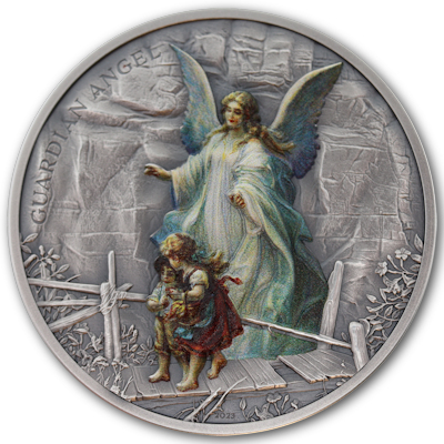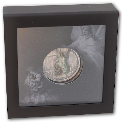 schutzengel-1-oz-silber-koloriert-wertseiteVorbild für die Gestaltung war ein historisches Gemälde. Die beiden Kinder sind offensichtlich vom Weg abgekommen und überqueren nun eine wacklige, halb verfallene Brücke. Doch über ihnen schwebt ein Engel mit wallendem Gewand als Zeichen dafür, dass die Geschichte gut ausgehen wird. Der Himmelsbote und seine Schützlinge sind koloriert, die Felsen im Hintergrund sind mit Antik-Finish gestaltet und treten durch das Hochrelief plastisch hervor. Oben ist randläufig der Name Guardian Angel eingeprägt. Das Sammlerstück aus 1 oz Feinsilber hat einen Feingehalt von 999/1000 und einen Durchmesser von 38, 61 Millimetern. Der Münzrand ist geriffelt. Ausgabeland sind die Cook Islands. Die Wertseite zeigt das Poträt von Königin Elizabeth II. über dem Nennwert von 5 Dollars. Im zugehörigen Präsentationsetui lässt sich das Sammlerstück, das exklusiv beim Münzhändler Silbertresor erhältlich ist, gut geschützt ausstellen.