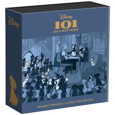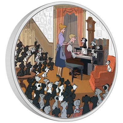 disney-101-dalmatiner-1-oz-silber-koloriert-dalmatian-plantation-etuiAm Ende des Films 101 Dalmatiner bereiten sich Roger und Anita gerade auf ein trauriges Weihnachtsfest ohne ihre Hunde vor. Doch Pongo und Perdita haben die Welpen längst aus den Fängen von Cruella de Vil befreit und stürmen bald mit der ganzen Horde das Haus. Auf dem Motiv der Silbermünze ist zu sehen, wie die Hunde, die teils noch mit Ruß bedeckt sind, sich im Wohnzimmer um das Klavier versammeln. Dort spielt Roger gerade seinen neuesten Hit Dalmatian Plantation, zu dem ihn die Tiere inspiriert haben. Pongo und Perdita haben die Pfoten auf das Klavier gelegt und lauschen ebenso gebannt wie Anita.