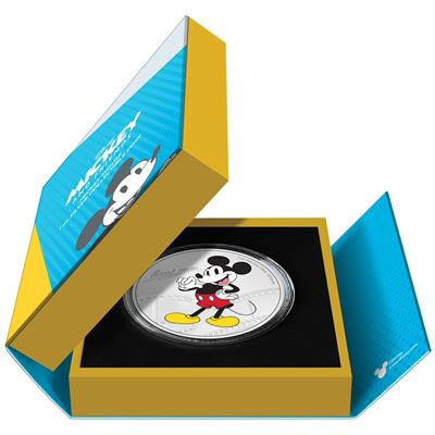mickey-mouse-1-oz-silber-koloriert-etuiKaum zu glauben, aber Micky Maus wird dieses Jahr schon 95! Man sieht es ihm wahrlich nicht an – allerdings hat er seit den 1920ern auch schon ein paar kleine „Liftings“ hinter sich. Von Zeit zu Zeit wurde die Figur nämlich vorsichtig optisch an den Zeitgeist angepasst. Trotzdem können Fans jedes Alters in der Maus noch den Helden ihrer Kindheit wiedererkennen. Auf dem Motiv der Silbermünze hat er sich ins Hohlkreuz geworfen und deutet stolz auf seine Brust. Oberhalb ist im Stil eines Autogramms der Name „Mickey Mouse“ zu lesen, sodass der bunt gestaltete Mäuserich zu sagen scheint: „Seht her, das bin ich!“