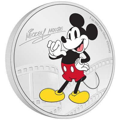mickey-mouse-1-oz-silber-koloriert-wertseiteDen Hintergrund für das kolorierte Motiv bildet ein silberner Filmstreifen. Die Silbermünze ist in höchster Proof-Qualität aus 1 oz Feinsilber (Feingehalt: 999/1000) geprägt. Sie hat einen Durchmesser von 40 Millimetern und einen geriffelten Rand. Die Wertseite zeigt das Siegel des Ausgabelandes Niue. Der Nennwert liegt bei zwei Dollars. Das Sammlerstück für Disney-Fans wird gekapselt und verpackt in ein buntes Etui ausgegeben. Ein Echtheitszertifikat gehört auch noch dazu.