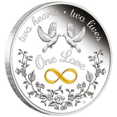 Zwei Tauben mit ausgebreiteten Flügeln, deren Schnäbel sich beinah berühren, darunter das golden kolorierte Unendlichkeitszeichen, darüber die Worte „two hearts, two lives, one love“: Das Sammlerstück aus Australien ist eine silberne Liebeserklärung. Auch die Blumen dürfen bei diesem Anlass natürlich nicht fehlen: Eine Girlande aus Blüten und Blättern, die sich in der unteren Hälfte am Rand entlang zieht, rundet das Motiv ab. Jedes Detail ist auf der in höchster Proof-Qualität geprägten Silbermünze liebevoll herausgearbeitet.