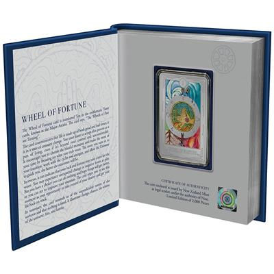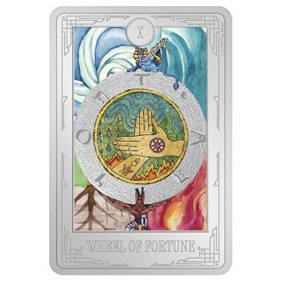 Mal ist man oben, mal ist man unten: Für die Wechselfälle des Lebens steht schon seit dem Mittelalter das Rad des Schicksals (Wheel of Fortune). Der Trumpf Nummer X eines Tarot-Decks zeigt ebenfalls das mystische Rad – und so auch die neueste Ausgabe der Tarot–Silbermünzen-Serie der New Zealand Mint. Das kolorierte Sammlerstück ist wie eine Spielkarte gestaltet und hat eine limitierte Auflage von nur 2.000 Exemplaren.