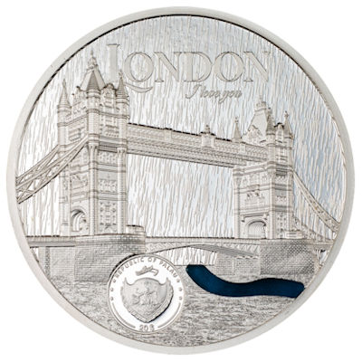 Die Wertseite präsentiert eines der bekanntesten Wahrzeichen der Stadt, die Tower Bridge. Darunter strömt die Themse. Darüber ist der Name London mit dem Zusatz „I love you“ zu lesen. Unten findet man den Nennwert von 20 Dollars und das Ausgabeland Palau. Die Silbermünze enthält 3 oz Feinsilber und hat einen Feingehalt von 999/1000. Der Durchmesser liegt bei 55 Millimetern. Das Sammlerstück ist ein ein Etui mit durchsichtigem Deckel verpackt. Hier kommt die Silbermünze vor einem Foto der nächtlichen Stadt bestens zur Geltung.