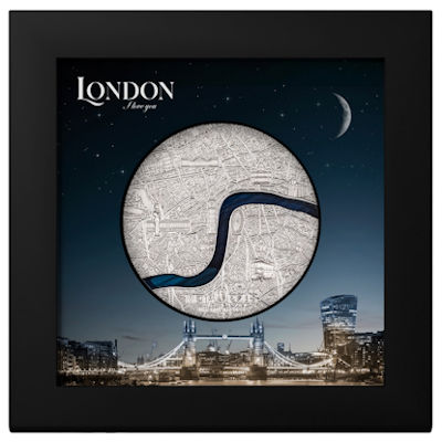 Aus der Vogelperspektive blicken Betrachter der Silbermünze auf die Stadt am Themse-Ufer. Einige der berühmtesten Sehenswürdigkeiten sind dabei allerdings hervorgehoben. Vor dem Buckingham-Palast steht sogar ein Wachsoldat mit der typischen Fellmütze. Unten ist ein Doppeldeckerbus unterwegs. Auch das Riesenrad London Eye, Big Ben, das British Museum, der Tower und St. Paul’s Cathedral sind aufgeprägt. Dazwischen ziehen sich Straßen durch die historischen und modernen Häuserschluchten, die von Plätzen und Parks unterbrochen werden. Die Prägung in High Relief verleiht dem Motiv eine schöne Dreidimensionalität.