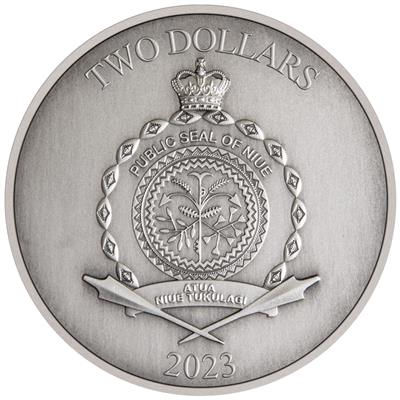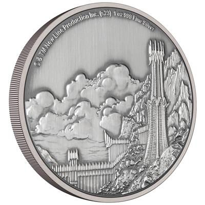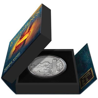 herr-der-ringe-mordor-1-oz-silber-wertseiteDie eingeprägte Szene erscheint durch das Antik-Finish noch schicksalhafter. Die Silbermünze aus 1 oz Feinsilber hat einen Durchmesser von 40 Millimetern. Sie enthält 1 oz Feinsilber bei einem Feingehalt von 999/1000. Der Münzrand ist geriffelt. Die Wertseite zeigt das offizielle Siegel des Ausgabelands Niue. Darüber ist der Nennwert von zwei Dollars angegeben. Die Sammelmünze ist verpackt in ein Etui mit Lord-of-the-Rings-Design und wird mit nummeriertem Echtheitszertifikat ausgegeben.