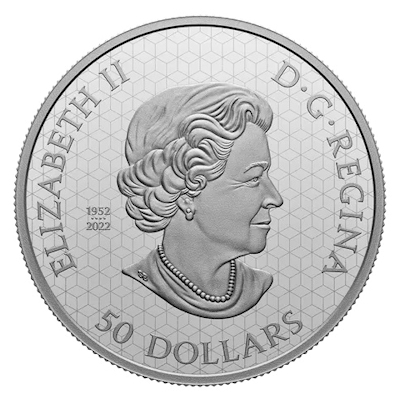 Für ein hohes Relief und ein großzügiges Motiv braucht es eine entsprechende Menge Material – in diesem Fall 5 oz Feinsilber mit einem Feingehalt von 99,99 Prozent. Der Durchmesser liegt bei 65,25 Millimetern. Der Münzrand ist geriffelt. Die Wertseite bleibt bei den Münzen der Royal Canadian Mint auch 2023 Königin Elizabeth II. vorbehalten. Ein Hinweis darauf, dass die Monarchin bereits verstorben ist, sind die daneben aufgeprägten Regierungsdaten. Vier Perlen zwischen den Jahreszahlen stehen für die vier unterschiedlichen Porträts der Königin, die im Laufe der Zeit die kanadischen Münzen zierten. Das jüngste und letzte stammt dabei von Susanna Blunt. Der Nennwert ist mit 50 CAD angegeben. Die in der höchsten Prägequalität Polierte Platte gefertigte Silbermünze wird gekapselt, im Etui und mit einem nummerierten Echtheitszertifikat ausgegeben.