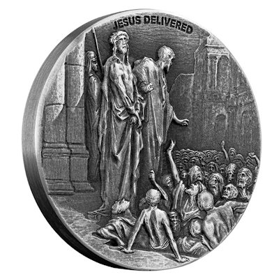 Jede Menge Bibelszenen hat die Scottsdale Mint in ihrer Silbermünzen-Serie bereits verewigt, abwechselnd aus dem Alten und dem Neuen Testament. Aus Letzterem stammt das Motiv dieser Ausgabe: Jesus wird von Pontius Pilatus zur Kreuzigung ausgeliefert. Vorbild für die Gestaltung war auch diesmal ein Holzschnitt von Gustve Doré. Das Sammlerstück mit Antik-Finish hat eine streng limitierte Auflage von nur 1499 Exemplaren.
