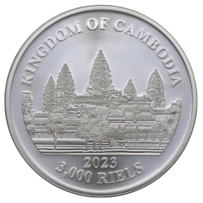 asian-big-five-elefant-1-oz-silber-koloriert-wertseiteDie Silbermünze zeigt eines der stolzen Tiere, wie es frontal auf den Betrachter zukommt. Die Palmen links und rechts überragt der Elefant deutlich. Über seinem Kopf ist der Name der Art verzeichnet, unten das Gewicht und der Feingehalt der Silbermünze: Sie enthält 1 oz Feinsilber bei einer Reinheit von 999/1000. Der Durchmesser beträgt 40,7 Millimeter. Umseitig zeigt das Sammlerstück in Stempelglanz-Prägung die berühmteste Sehenswürdigkeit des Ausgabelandes Kambodscha – den Temepl von Angkor Wat. Darunter ist der Nennwert von 3.000 Riels angegeben; ein eher symbolischer Wert, denn umgerechnet handelt es sich nicht einmal um einen Euro. Die Silbermünzen haben einen geriffelten Rand und werden einzeln gekapselt ausgegeben.