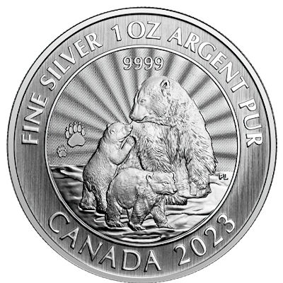 Das Motiv der Silbermünze präsentiert eine Eisbärin mit ihrem Nachwuchs. Eines der Bärchen hat die Vorderpfoten in die Flanke der Mutter gestemmt und reckt ihr die Nase entgegen. Das andere erkundet neugierig die Umgebung. Alle drei wirken wohlgenährt und haben dichtes Fell, das gut zur Geltung kommt. Im Hintergrund breiten sich Strahlen wie von der aufgehenden Sonne aus. Zusätzlich ist das Silberstück mit zwei Tatzenabdrücken „abgestempelt“: ein großer von der Mutter und ein kleiner von einem der Nachwuchs-Bärchen.