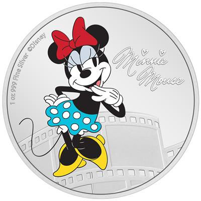 Schleife zwischen den Ohren, Pünktchenrock, auffällige Unterhosen und gelbe High Heels: Für die Silbermünze hat Minnie sich in Schale geworfen. Kokett stützt sie eine Hand auf die Hüfte und klimpert mit ihren langen Wimpern. Neben der kolorierten Figur ist ihr „Autogramm“ aufgeprägt, wobei die I-Punkte natürlich Herzchen sind. Ein Filmstreifen im Hintergrund rundet das Bild ab. Minnie begleitete Micky Maus von Anfang an und ist damit inzwischen ebenfalls rund 95 Jahre alt. Wie ihr Verehrer hat sie einen Stern auf dem Hollywood Walk of Fame erhalten.