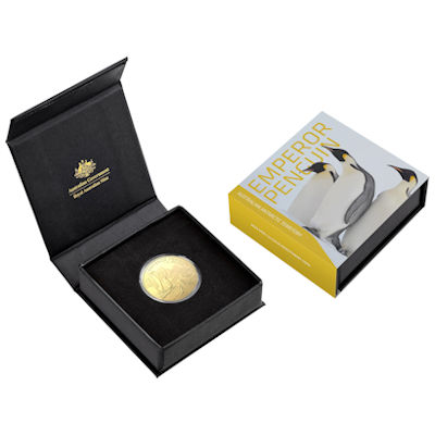 Oben ist randläufig der Name Emperor Penguin verzeichnet. Die Goldmünze hat einen Durchmesser von 38,70 Millimetern. Sie enthält 1 oz Feingold bei einem Feingehalt von 99,99 Prozent. Auf der Wertseite ist unter dem Porträt der Queen der Nennwert von 100 Dollars aufgeprägt. Oben sind die Regierungsdaten der Königin zu finden. Der Münzrand ist geriffelt. Die Bullionmünze ist in Stempelglanz-Qualität geprägt, wird aber gekapselt und in einem Etui mit Pinguin-Bild ausgegeben.