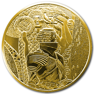 wiener-secession-16-g-gold-etuiOtto Wagner, Egon Schiele und allen voran Gustav Klimt – große Namen sind mit dem Wiener Jugendstil verbunden. In der Hauptstadt der Sisi-Romantik erinnert heute noch vieles an die Kunstbewegung der vorletzten Jahrhundertwende, die mit dem Alten brechen wollte, unter dem Motto: „Der Zeit ihre Kunst. Der Kunst ihre Freiheit.“ Ihren größten Erfolg feierten die Künstler der Secession 1902 mit einer Ausstellung zu Beethoven. In diesem Zusammenhang entstand auch Klimts bekannter Beethovenfries, von dem das Motiv der Goldmünze inspiriert ist. Das Original ist zwei Meter hoch und insgesamt 34 Meter lang.