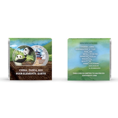 Üppige grüne Felder am Berghang, satter brauner Ackerboden und ein Laubbaum, aus dem einer der beiden Pandas auf dem Motiv der Silbermünze herauslugt: So ist die Erde dargestellt. Als Symbol für das Element ist unter der Seriennummer ein Zweig mit Blättern abgebildet. Die beiden spielenden Jungbären sind übrigens so auch auf dem Motiv der Anlagemünze China Panda 2023 zu sehen. Durch die Farbapplikationen wirken sie mit ihrem schwarz-weißen Fell und den runden Ohren noch niedlicher.