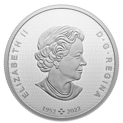 Links ist randläufig der Nennwert von 50 CAD verzeichnet. Die Silbermünze aus 3 oz Feinsilber hat einen Feingehalt von 99,99 Prozent und einen Durchmesser von 55,0 Millimetern. Der Münzrand ist geriffelt. Umseitig ist das Susanna-Blunt-Porträt von Königin Elizabeth II. vor einem Hintergrund aus Ahornblättern aufgeprägt. Die Daten 1952 und 2022 am unteren Rand weisen auf die Regierungszeit der Queen hin. Das in höchster Proof-Qualität geprägte Sammlerstück ist gekapselt und in ein Etui verpackt. Ein Echtheitszertifikat gibt es dazu.