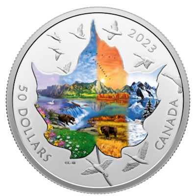 Wer bemerkt, dass das Ahornblatt auf dem Motiv der Silbermünze anders aussieht als gewohnt, hat völlig recht. Als Vorbild diente diesmal ein Blatt des Schwarzahorns (acer nigrum). Durch die im Vergleich zum Zuckerahorn weniger ausgeprägten Einkerbungen ist die Fläche für das kolorierte Motiv größer. Umrahmt ist das Blatt von einem Schwarm Kanadagänse, die ebenfalls Boten des Jahreszeitenwechsels sind. Das Innere des Blattes zeigt eine Kollage mit vier Teilen: links die Blütenwiesen des Frühlings mit einem Schwan, der übers Wasser gleitet, daneben das üppige Grün des Sommers mit einem Grizzly auf der Jagd nach Fisch, dann die rot-goldenen Farben des Herbstes, in die sich perfekt ein weidender Bison einfügt, und schließlich die Schneelandschaften des Winters mit einem gut getarnten Polarfuchs.