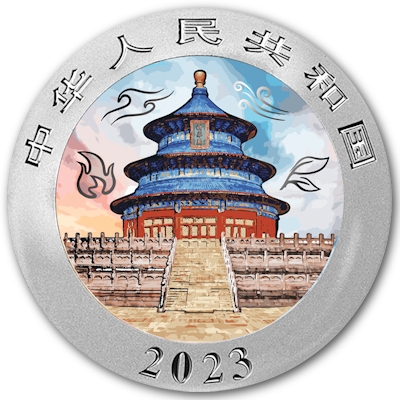 Die Kolorierung setzt sich umseitig fort. Wie man es vom China Panda kennt, ist hier ein Teil des Himmelstempels in Peking abgebildet. Er strahlt den Betrachtern farbig entgegen und wird von den Symbolen aller vier Elemente umrahmt. Unten ist die Jahreszahl 2023 eingeprägt. Die in Stempelglanz-Qualität geprägten Silbermünzen haben einen Durchmesser von 40 Millimetern und einen Feingehalt von 999/1000. Der Münzrand ist geriffelt. Anders als die meisten Bullionmünzen enthalten die Pandas nicht eine Unze, sondern 30 Gramm Feinsilber.
