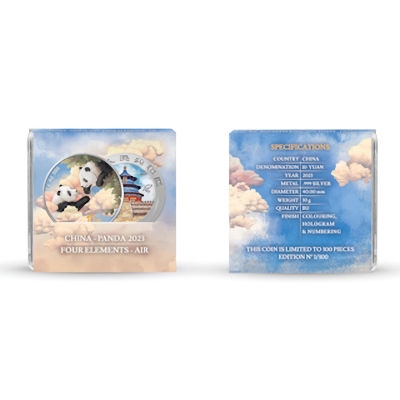 Erde, Feuer, Wasser und Luft – die vier Elemente sind das Thema einer Sonderserie der Silbermünze China Panda. Vier kolorierte Editionen mit einer Auflage von je nur 300 Exemplaren sind für die Münzsammler zu haben. Jede variiert das Panda-Motiv des Jahrgangs 2023. Beim Element Luft scheinen die beiden niedlichen Panda-Bären in den Wolken zu schweben.
