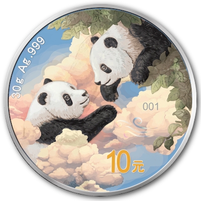 Zwei spielende Bären zeigt das Motiv der Silbermünze China Panda 2023. Einer lugt dabei aus einem Baum hervor, der andere streckt sich ihm von unten entgegen. Auf dieser kolorierten Variante ist letzterer von watteweich gezeichneten Wolken umgeben. Beide haben den typischen Kuscheltier-Look der Großen Pandas mit den runden Ohren und den schwarz umrandeten Augen. Auf einer der Wolken ist die Seriennummer verzeichnet, darunter das Symbol für das Element Luft. Auch der Nennwert von 10 Yuan ist zu sehen. Die Sonderausgaben gelten jedoch nicht als gesetzliches Zahlungsmittel.