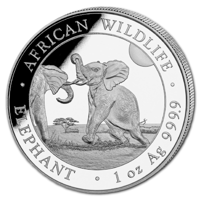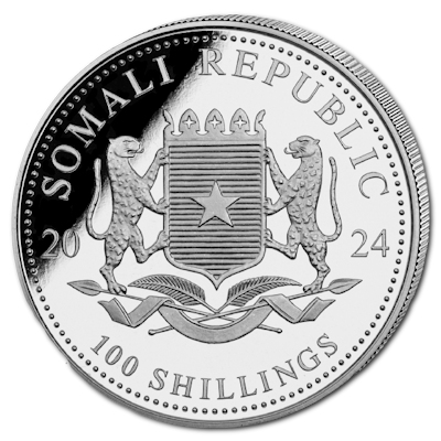 Die Silbermünze zeigt die Elefanten in einer typischen Steppenlandschaft. Das Bild ist von einem Rahmen umgeben, auf dem der Name „African Wildlife Elephant“ und die Angaben zu Gewicht und Feingehalt aufgeprägt sind. Die Anlagemünze enthält 1 oz Feinsilber und hat einen Feingehalt von 99,99 Prozent. Auf der Wertseite ist das Wappen des Ausgabelandes Somalia abgebildet. Zwei Leoparden, die auf gekreuzten Speeren stehen, halten den Wappenschild. Links und rechts davon sind die beiden Hälften der Jahreszahl 2024 aufgeprägt, unten ist der Nennwert von 100 Shillings angegeben. Der Münzrand ist geriffelt. Die Silbermünzen sind in Stempelglanz-Qualität geprägt.