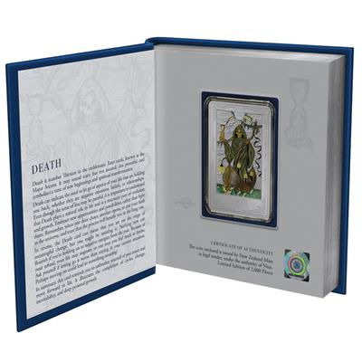 tarot-death-1-oz-silber-koloriert-wertseiteDas Motiv der Silbermünze ist wie eine Spielkarte gestaltet. Sowohl das kolorierte Bild des Todes als auch die Wertseite sind von einem Rahmen umgeben, der diesen Eindruck hervorruft. Die in höchster Proof-Qualität geprägte Silbermünze enthält 1 oz Feinsilber (Feingehalt: 999/1000) und ist 53 mal 36 Millimeter groß. Sie hat einen geriffelten Rand. Die Wertseite zeigt das Siegel des Ausgabelandes Niue und den Nennwert von 2 Dollars. Verpackt ist das Sammlerstück in ein buchartiges Etui, das auch Informationen zu der Bedeutung der Tarot-Karte enthält.