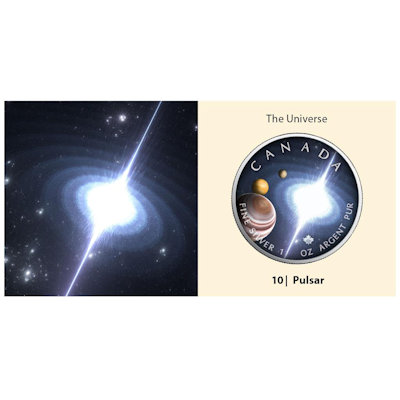 Ein faszinierendes Objekt ziert die zehnte Ausgabe der Maple-Leaf-Sonderserie Universum: Wie kosmische Leuchttürme blinken Pulsare am Himmel, doch sie weisen nicht den Weg an ferne Gestade, sondern markieren das Ende eines Sterns. Das kolorierte Motiv der Silbermünze veranschaulicht die Strahlung, die von dem Objekt ausgeht. Die Auflage ist limitiert auf nur 2.500 Exemplare.