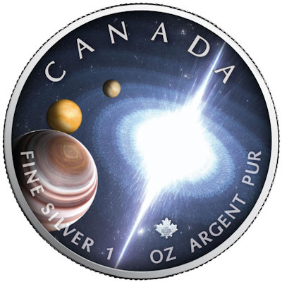 Hell strahlend ist der Pulsar der Blickfang auf dem Motiv der Silbermünze. Mehrere Planeten sind um ihn angeordnet. Ein kleines Ahornblatt erinnert an das eigentliche Motiv der Anlagemünze Maple Leaf. Das Sammlerstück enthält 1 oz Feinsilber bei einem Feingehalt von 99,99 Prozent und hat einen Durchmesser von 38,00 Millimetern. Der Münzrand ist geriffelt. Die Wertseite zeigt das Susanna-Blunt-Porträt von Königin Elizabeth II. Daneben sind die Regierungsdaten der Queen verzeichnet. Der Nennwert beträgt 5 CAD. Die Silbermünze ist in Stempelglanz-Qualität geprägt und wird mit einer Produktkarte ausgegeben.