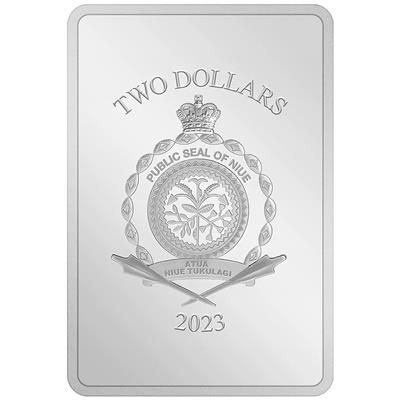 indiana-jones-tempel-des-todes-1-oz-silber-koloriert-wertseiteAuf dem Filmplakat – und so auch auf dem Motiv der Silbermünze – steht Indiana Jones zwischen den mächtigen Säulen eines Tempels. Die Peitsche hält er lässig in der Hand. Schlingpflanzen deuten auf das warme Klima Indiens hin. Das Sammlerstück ist 53,00 mal 36,00 Millimter groß und enthält 1 oz Feinsilber bei einem Feingehalt von 999/1000. Auf der Wertseite findet man das offizielle Siegel des Ausgabelands Niue unter dem Nennwert von zwei Dollars und über der Jahreszahl 2023. Die Silbermünze ist gekapselt und in ein passendes Etui mit Sichtfenster verpackt. Ein Echtheitszertifikat gehört dazu.