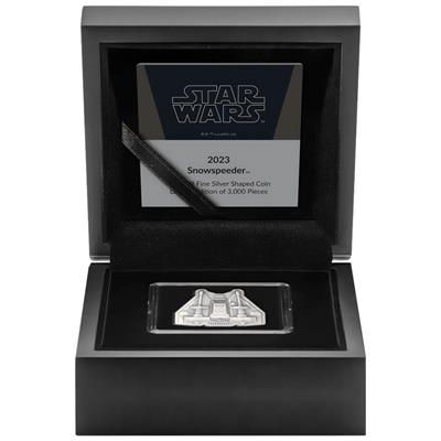 star-wars-snowspeeder-1-oz-silber-wertseiteDie Silbermünze in Formprägung liefert einen detailgenauen Eindruck von dem Schiff. Sie ist 36,00 mal 30,80 Millimeter groß und enthält 1 oz Feinsilber (Feingehalt: 999/1000). Wer sie umdreht, findet das offizielle Siegel des Ausgabelands Niue und den Nennwert von zwei Dollars. Auch die Jahreszahl 2023 und der Copyright-Hinweis, der die Silbermünze als lizenziertes Produkt der Lucasfilm Ltd. kennzeichnet, sind auf dieser Seite zu finden. Ausgeliefert wird das Sammlerstück gekapselt, im Etui und verpackt in einen schwarzen Shipper mit Star-Wars-Logo. Ein Echtheitszertifikat gehört dazu.