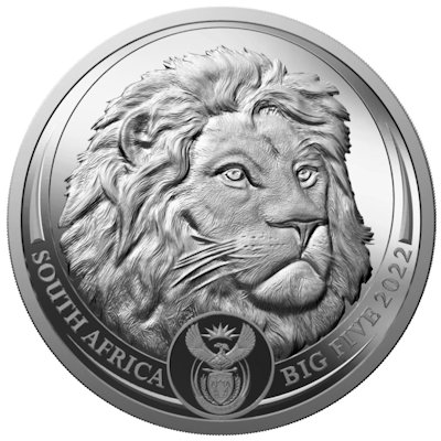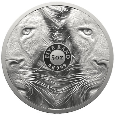 big-five-ii-lion-5-oz-silber-wertseiteDer Löwe auf dem Motiv der Silbermünze scheint prächtig in Form zu sein. Sein Kopf mit der dichten Mähne nimmt fast die ganze Fläche ein. Unten ist mittig das Wappen von Südafrika platziert. Auch die Wertseite zeigt den Löwen. Die Darstellung von zwei Gesichtshälften des jeweiligen Tieres auf dieser Seite ist ein Markenzeichen der Serie. Die Nennwertangabe von 5 Rand ist in der Mitte platziert. Außerdem sind das Gewicht von 5 oz Feinsilber und der Feingehalt von 999/1000 hier angegeben. Die Silbermünze in Stempelglanz-Prägung hat einen geriffelten Rand. Sie wird gekapselt und im Etui ausgegeben.