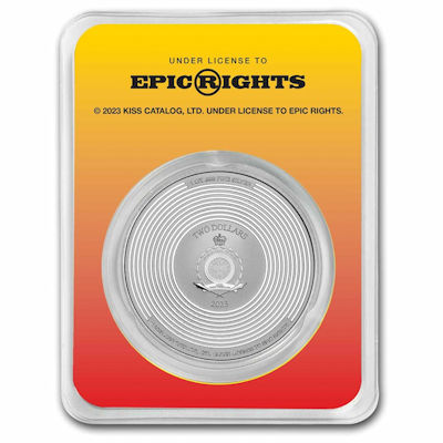 Die Silbermünze hat einen Durchmesser von 39 Millimetern und enthält 1 oz Feinsilber (Feingehalt: 999/1000). Sie ist in Stempelglanz-Qualität geprägt und leuchtend koloriert. Auf der Wertseite findet man das offizielle Siegel des Ausgabelands Niue und den Nennwert von 2 Dollars. Passend zum musikalischen Thema ist sie wie eine Vinylplatte gestaltete. Das Sammlerstück 50 Jahre KISS wird in einer Blisterverpackung ausgegeben. Auch ein silbernes Guitar Pick ist erhältlich.