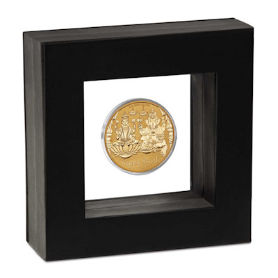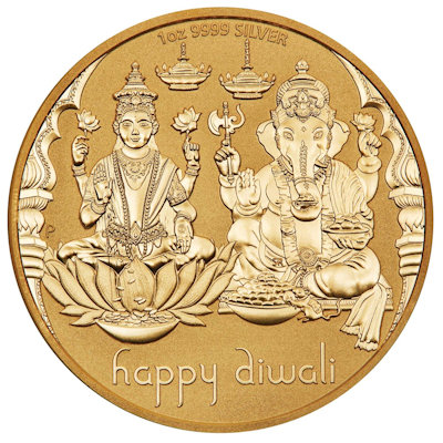 Zu Diwali werden Häuser, Straßen und Geschäfte mit Lampen und Kerzen geschmückt, außerdem gibt es Feuerwerk. Gefeiert wird der Sieg des Guten über das Böse, wobei das Fest in verschiedenen Regionen mit unterschiedlichen Göttern in Verbindung gebracht wird. Eine davon ist Lakshmi, die Göttin des Wohlstands, die auf dem Motiv der Silberprägung auf einer Lotosblüte sitzend dargestellt ist. Aus ihrer offenen Hand fallen Münzen in eine Schüssel. Neben ihr sitzt Ganesha, der an seinem Elefantenkopf zu erkennen ist. Er hält ein Beil als Waffe gegen Böses und eine Lotosblüte hoch. Vor ihm steht eine Schüssel mit Süßigkeiten, aus der ein Mäuschen eine Leckerei anbietet. Unten vervollständigt der Schriftzug „Happy Diwali“ das Motiv.