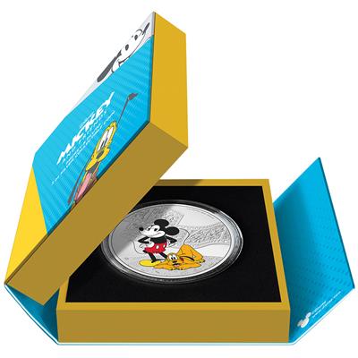 Nach wie vor ist Micky Maus die Symbolfigur der Disney-Traumfabrik. Die New Zealand Mint hat dem Mäuserich und seinen Freunden schon einige Sammlerstücke gewidmet. Auf dieser Silbermünze mit einem großen Durchmessers von 60 Millimetern findet man eine nostalgische Darstellung. Micky hat stolz die Hände in die Seiten gestemmt, Pluto liegt als treuer Hund zu seinen Füßen. Die farbenfrohe kolorierten Helden stehen vor einem Filmstreifen-Hintergrund mit Szenen aus den gemeinsamen Cartoons. Das Sammlerstück ist in der Qualität Polierte Platte hergestellt und enthält 3 oz Feinsilber bei einem Feingehalt von 999/1000. Der Münzrand ist geriffelt. Den Nennwert von 10 Dollars findet man über dem offiziellen Siegel des Ausgabelands Niue. Verpackt ist das Sammlerstück, bei dem es sich um ein lizenziertes Disney-Produkt handelt, in ein passendes Etui. Ein nummeriertes Echtheitszertifikat gehört dazu.