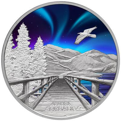 Die Wahrscheinlichkeit, Nordlichter zu beobachten, ist umso größer, je mehr man sich den Polen nähert. Sie entstehen durch geladene Teilchen des Sonnenwinds, die auf Moleküle der Erdatmosphäre treffen. Damit sie besonders schön leuchten, sollte die Lichtverschmutzung in der Umgebung gering sein. Je dünner die Gegend besiedelt ist, desto besser ist es also für den Polarlichter-Tourismus. Alaska, Yukon in Kanada, Grönland oder die Inselgruppe der Lofoten gehören zu den Reisetipps. Das Motiv der Silbermünze zeigt die typischen Lichtvorhänge diesmal nicht in Grün, sondern in Blau. Sie spiegeln sich im ebenfalls kolorierten Wasser, über das eine Holzbrücke führt. Im Hintergrund sind Nadelbäume und Berge zu sehen, außerdem segelt ein großer Vogel über den Himmel.