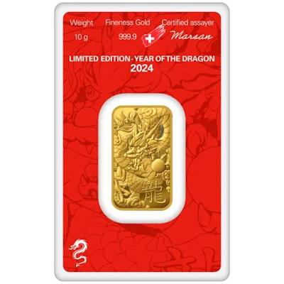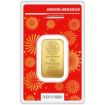 Der Feingehalt liegt bei 999,9/1000. Diese Angabe findet man umseitig zusammen mit dem Argor-Hereaus-Logo. Auch die Seriennummer des Barrens ist verzeichnet. Ausgegeben werden die Goldbarren in der leuchtend roten Blister-Verpackung, auf der in der Ecke noch ein kleiner Drache versteckt ist. Wer das passende Anlageobjekt oder Sammlerstücke zum Jahr des Drachen sucht, hat auch einige Münzen zur Auswahl, etwa von der Perth Mint.