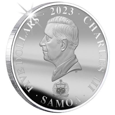 Die Silbermünze ist in Stempelglanz Qualität geprägt und hat einen geriffelten Rand. Sie enthält 1 oz Feinsilber bei einem Feingehalt von 999,9/1000. Der Durchmesser liegt bei 38,61 Millimetern. Auf der Wertseite findet man das Porträt von König Charles III., daneben den Nennwert von 5 Dollars. Als Ausgabeland fungiert Samoa. Das Sammlerstück kommt in Blisterverpackung und ist eingebettet in einen Blick auf die Sterne.