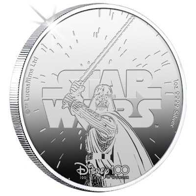 2012 verkaufte Star-Wars-Schöpfer George Lucas sein gesamtes Unternehmen an die Disney Company. Deren Einkaufstour der jüngeren Vergangenheit umfasst aber noch viel mehr: Wo Marvel, Pixar, Searchlight oder 20th Century im Filmvorspann auftaucht, steckt ebenfalls Disney dahinter. Dazu kommen Radio- und TV-Sender, Streamingdienste, Musicalproduktionen, Musiklabel und mehr. Nicht zu vergessen die Freizeitparks und Resorts. Dort können Besucher Teil der Star-Wars-Welt werden und durchs All fliegen. Anders als Micky Maus, der zum Geburtstag ein Ständchen mitbringt, grüßt Darth Vader auf der Silbermünze stilecht mit dem Lichtschwert. Hinter ihm ist das Star-Wars-Logo zu sehen, unten das Disney-Jubiläumslogo.