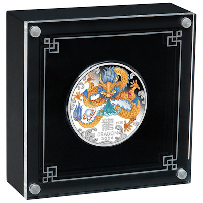 Dieser Drache speit kein Feuer, sondern Wasser: Die neue Silbermünze der Lunar-Serie III der australischen Perth Mint wirkt mit Farbapplikationen besonders schön. Fans der Fabelwesen werden sich freuen – und natürlich ist das Sammlerstück eine ideale Geschenkidee als Glücksbringer zum kommenden Jahr des Drachen. Die Auflage ist auf 6.000 Exemplare limitiert.