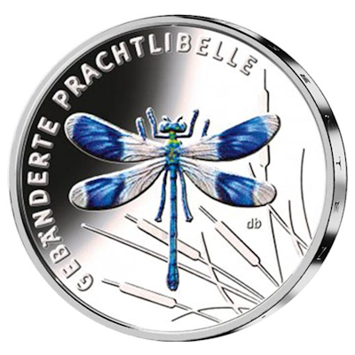 Ihre auffällig gemusterten Flügel und die metallisch-blaue Farbe haben der Gebänderten Prachtlibelle zu ihrem Namen verholfen. Beides ist auf dem Motiv der Münze gut zu sehen. Einen kleinen Eindruck bekommt man auch von ihrem Lebensraum – durch die Schilfhalme, die von unten ins Bild ragen. Die Insekten leben im Uferbereich von Flüssen und Bächen. Etwa ab Mitte Mai flattern die fertig entwickelten Libellen durch ihr Revier. Mit einer Länge von bis zu fünf Zentimetern und einer Flügelspannweite von bis zu sieben Zentimetern sind sie gar nicht so schwer zu entdecken.
