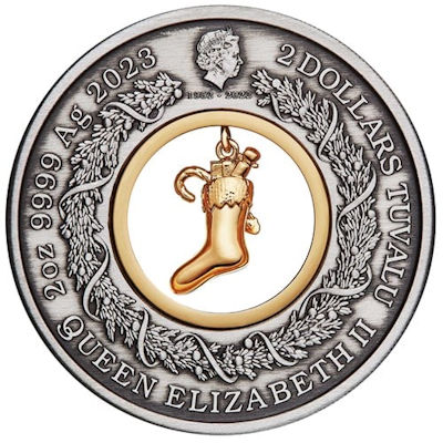 Der Blickfang ist jedoch die Mitte mit der Aussparung für einen bereits gut gefüllten Weihnachtsstrumpf, der mit einer 24-Karat-Vergoldung veredelt ist. Die Silbermünze aus 2 oz Feinsilber (Feingehalt 99,99 Prozent) ist mit einem stilvollen Antik-Finish überzogen. Sie hat einen Durchmesser von 45,60 Millimetern bei einer maximalen Dicke von 6,5 Millimetern. Der Münzrand ist geriffelt. Auf der Wertseite umgibt ein festlicher Kranz das Fenster. Das Porträt von Königin Elizabeth II. ist nach oben verschoben. Rechts davon findet man den Nennwert von 2 Dollars und das Ausgabeland Tuvalu, links die Jahreszahl, den Feingehalt und das Gewicht. Das Sammlerstück wird eingebettet in ein durchsichtiges Präsentationsetui ausgeliefert. Eine weihnachtliche Umverpackung und nummeriertes Echtheitszertifikat gehören außerdem dazu.