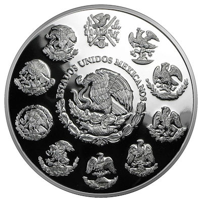 libertad-2023-5-oz-silber-2Die Rückseite der Libertad ziert das Nationalwappen Mexikos, ein Adler mit einer Schlange im Schnabel. Rund herum sind zehn historische Wappen abgebildet. Die Silbermünze wird von der Casa de Moneda de México geprägt und von der Banco de México ausgegeben. Anleger haben bei der Libertad in Silber die Wahl zwischen verschiedenen Stückelungen, von 1/20 Unze über 1/10 oz, 1/4 oz, 1/2 und natürlich 1 oz Feinsilber bis hin zu 1 Kilogramm Silber. Der Feingehalt liegt bei 999/1000. Die Ausgabe aus 5 oz Silber in höchster Prägequalität Polierte Platte hat einen Durchmesser von 65 Millimetern und wird einzeln gekapselt ausgeliefert. Die Libertad gilt als gestzliches Zahlungsmittel in Mexiko, trägt aber keinen festen Nennwert. Dieser wird durch den Materialwert des Silbers festgelegt.
