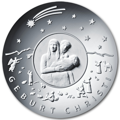 Maria mit dem fest eingewickelten Jesuskind im Schoß, Josef, der sich von hinten über sie beugt und den Kopf des Babys hält: Dieses innige Bild hat die Künstlerin Adelheid Fuss für die Silbermünze entworfen. Es bildet das Zentrum des Sammlerstücks. Ringsum sind aber noch weitere typische Krippenszenen zu erkennen: Die Hirten auf dem Felde halten Wache bei ihren Schafen, als ihnen der Engel erscheint. Die Heiligen Drei Könige bringen Geschenke und haben auch ein Kamel dabei. Am Nachthimmel funkeln mehrere kleine Sterne und ganz oben komplettiert der Bethlehemstern die weihnachtliche Szene. Ganz unten ist auch noch die Aufschrift „Geburt Christi“ aufgeprägt.