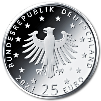 Weniger festlich präsentiert sich die Wertseite, die wie üblich den Bundesadler und die Europasterne zeigt. Unten ist der Nennwert von 25 Euro verzeichnet, daneben die Jahreszahl 2021. Seitlich findet man das Zeichen der Prägestätte. Die Silbermünze hat ein Gewicht von 22 Gramm und einen Durchmesser von 30,0 Millimetern. Der Feingehalt liegt bei 999/1000. Der Münzrand ist glatt. Die Silbermünze in Spiegelglanz-Prägung wird gekapselt und im weihnachtlich roten Blister ausgegeben.