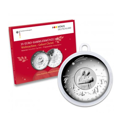 Nicht Geschenke, Lichterglanz und Christbäume stehen eigentlich im Mittelpunkt der Weihnachtsgeschichte, sondern das Wunder der Geburt. Daran erinnert dieses Jahr eine Silbermünze der Bundesrepublik Deutschland. Sie stellt wie bei einer Krippe die heilige Familie ins Zentrum des Weihnachtsgeschehens. Die Version in Spiegelglanz-Prägung hat eine limitierte Auflage von 150.000 Stück. Sie ist in eine Kapsel mit Öse verpackt, sodass die Silbermünze schnell als Weihnachtsdekoration einsetzbar ist.