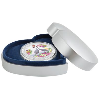 love-is-precious-2024-1-oz-silber-etuiFür das Motiv dieser numismatischen Liebeserklärung werden mit Vorliebe Vögel gewählt, die monogam leben. Das gilt auch für die Saruskraniche. Noch dazu sind die Vögel, die in freier Wildbahn im Süden und Südosten Asiens vorkommen, für ihre beeindruckenden Balztänze bekannt. Stehend können Vertreter dieser größten Kranich-Art übrigens eine Höhe von bis zu 1,80 Metern erreichen. Auf dem Motiv der Silbermünze bilden zwei im Wasser stehende Saruskraniche mit ihren roten Köpfen und langen Hälsen beinah ein Herz und spiegeln so das Zirkonia-Herz direkt darüber. Eingerahmt ist die Szene von bunten Blüten. Auf einem silbernen Rahmen um das Motiv ist unten der Titel „Love is Precious“ zu lesen.