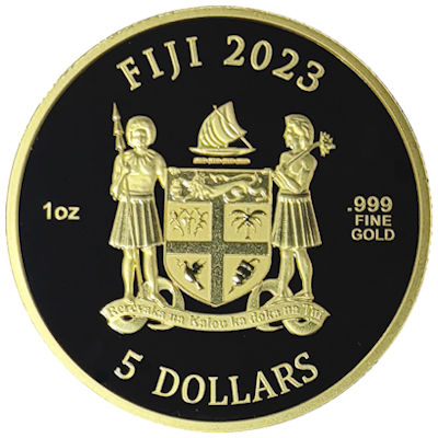 fiji-dogs-2023-1-oz-gold-wertseiteDer Hundeblick verfehlt selten seine Wirkung. Vielleicht verleitet er den ein oder anderen auch zum Kauf dieser Goldmünze. Dafür erhält er 1 oz Feingold mit einem Feingehalt von 999/1000. Die Wertseite zeigt das Wappen des Ausgabelands Fidschi: Darauf sind typische einheimische Früchte – Zuckerrohr, eine Bananenstaude und eine Kokospalme – zusammen mit einem Löwen auf einem Wappenschild zu sehen, der von einem Schiff gekrönt wird. Zwei Krieger halten den Schild. Unten ist der Nennwert von 5 Dollars verzeichnet. Die Goldmünzen werden einzeln gekapselt ausgegeben.