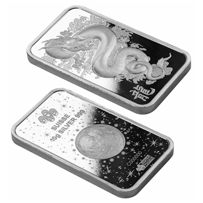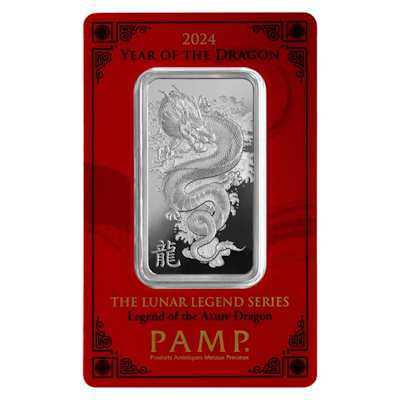 Der azurblaue Drache des Ostens beschäftigt nicht nur die Perth Mint, sondern auch das schweizer Unternehmen PAMP (Produits Artistiques Métaux Précieux), das der Lunar-Legende eine Serie von Silberbarren gewidmet hat. Diese beeindrucken mit einem detailreichen Design auf beiden Seiten. Die Verpackung ist in der Glücksfarbe Rot gehalten und vermittelt zusätzlich Informationen über das Fabeltier und seine Stellung im Lunar-Zyklus.