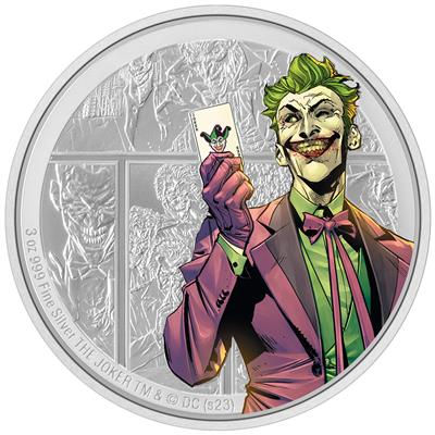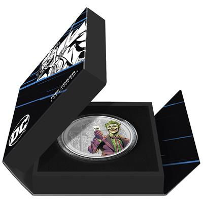 Die Silbermünze zeigt die kolorierte Version des Schurken im Vordergrund. Dahinter sind verschiedene Comic-Szenen mit dem Joker aufgeprägt. In der großen Version kommt dieses Design sehr gut zur Geltung. Das Sammlerstück hat einen Durchmesser von 55,00 Millimetern und einen Feingehalt von 999/1000. Es enthält 3 oz Feinsilber. Der Münzrand ist geriffelt. Die Wertseite zeigt das offizielle Siegel des Ausgabelands Niue. Oben ist der Nennwert von 10 Dollars angegeben. Die in der höchsten Prägequalität Polierte Platte hergestellte Silbermünze wird es gekapselt und in einem Etui ausgegeben, auf dem hinten das Echtheitszertifikat aufgedruckt ist.
