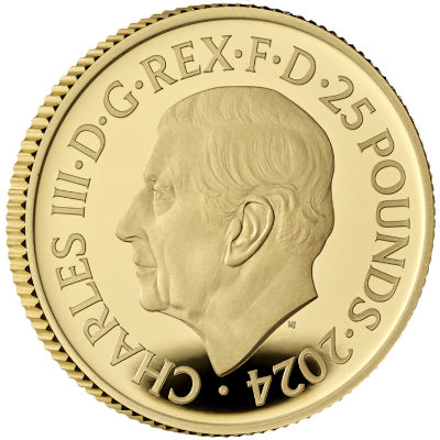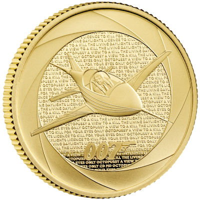 Die Goldmünze zeigt Bond im Cockpit des Kleinflugzeugs vor einem Hintergrund aus Filmtiteln. Der aus dem Vorspann bekannte Pistolenlauf-Rahmen und das 007-Logo ergänzen das Motiv. Das Sammlerstück ist in höchster Proof-Qualität hergestellt und hat einen Durchmesser von 22,00 Millimetern. Es enthält 1/4 oz Feingold bei einem Feingehalt von 99,99 Prozent und hat einen geriffelten Rand. Die Wertseite zeigt das Porträt von König Charles III. und den Nennwert von 25 Pfund. Die Goldmünze wird gekapselt, im stilvollen Holzetui und mit Echtheitszertifikat ausgegeben.
